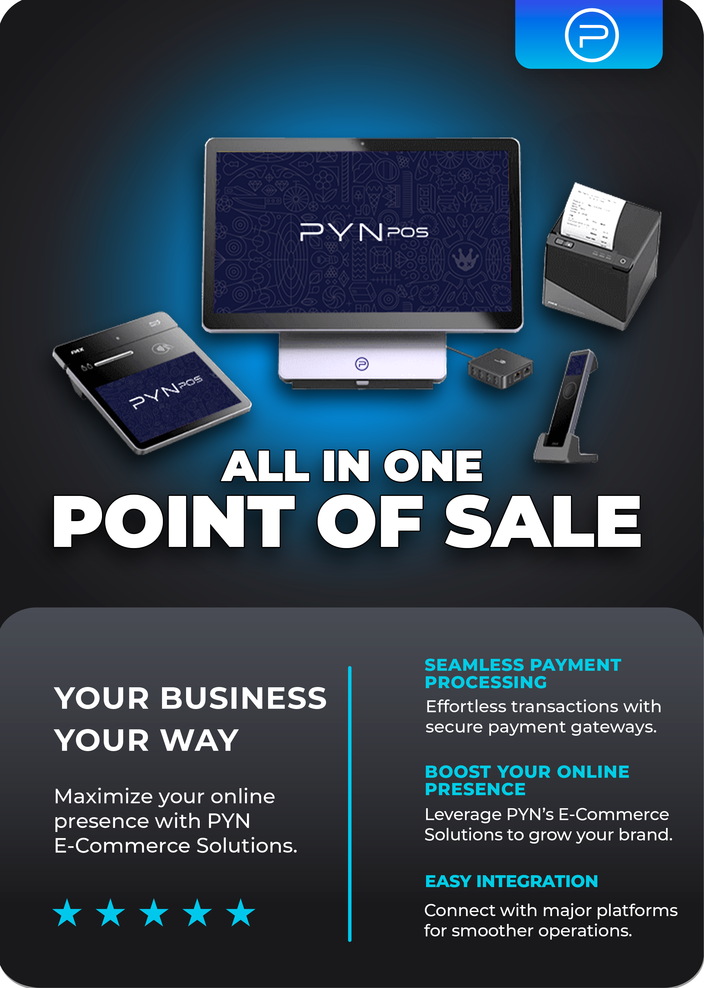 Empower your business with PYN’s all-in-one payment processing and POS solutions. Easily accept payments, track sales, manage inventory, and enhance customer experiences—all in one place. Whether you’re in-store or on the go, our secure, user-friendly systems are designed to help your business grow.